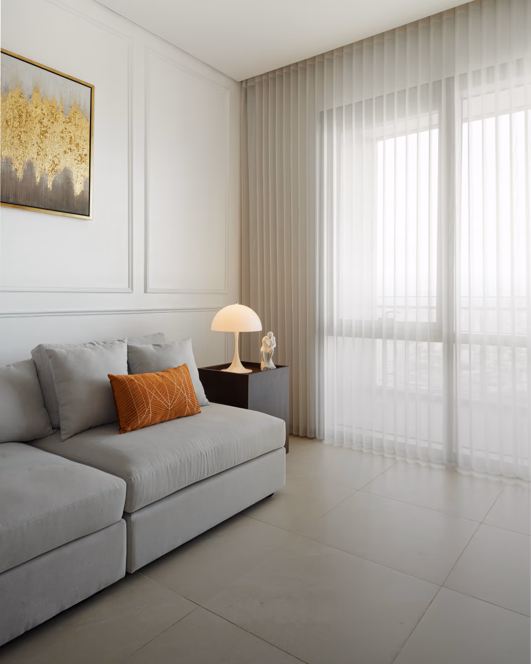Sheers are lightweight, translucent fabric panels that filter sunlight while maintaining a soft view of the outdoors. They provide daytime privacy but are not opaque. Drapery, by contrast, uses heavier fabrics with optional blackout or thermal linings that block light completely and provide full privacy and insulation. In architectural layering, sheers and drapery are often combined on a dual-track system: the sheers sit closest to the glass for light filtering, while the lined drapery panels layer in front for full light control, privacy, and acoustic dampening when needed.