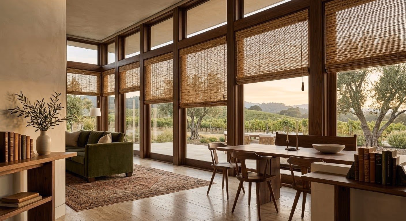 Each material in the Hartmann and Forbes collection brings a distinct texture, color range, and light-filtering quality to a room. Jute is the most versatile fiber, offering a soft, woven textile feel with warm golden-to-brown tones that complement both modern and traditional interiors. Jute weaves range from tight, semi-opaque panels that diffuse light evenly to open weaves that allow dappled sunlight to pass through. Bamboo delivers a clean, linear grain with subtle natural variation in each stalk. It is lighter in color than jute and particularly effective in rooms where a bright, airy feel is desired. Bamboo shades pair well with the custom drapery layering approach that many designers favor for vineyard estates.