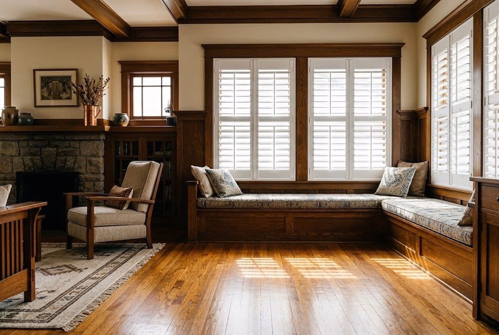 Installed custom Heritance® hardwood shutters in a 1908 Craftsman on Johnson Street, Healdsburg (ZIP 95448). The renovation, coordinated with Murphy McKenna Construction, required shutters that matched the home's original dovetail window casings. We custom-templated 14 windows including two arched transoms, specifying 3.5-inch basswood louvers with a hand-matched Colonial White stain to complement the restored Douglas fir trim. The Healdsburg Historical Society confirmed the installation met preservation guidelines. Total project: 6 weeks from template to final installation.