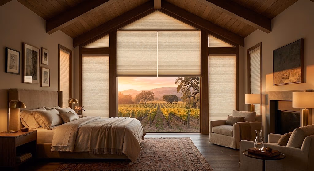 Healdsburg Mill District bedrooms with floor-to-ceiling glass require Lutron Palladiom motorized shades with recessed headrail pockets specified during construction, while Windsor ranch-style master suites with standard 6-foot windows achieve optimal blackout with Duette LightLock inside-mount systems.
