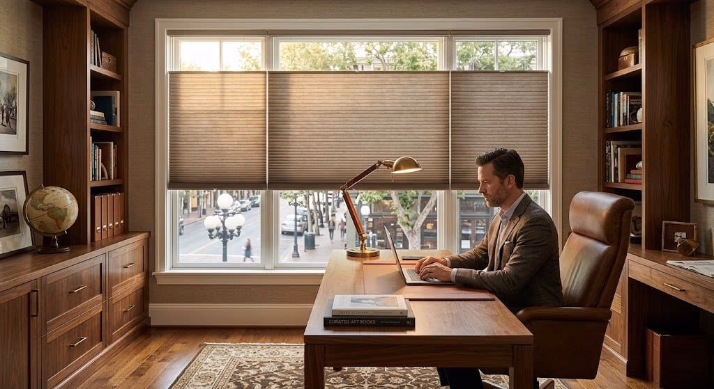 Home offices occupied during peak afternoon heat benefit significantly from solar control. Without shading, a west-facing office window can raise room temperature by 5 to 10 degrees above the rest of the house, forcing the HVAC system to work harder. Screen shades intercept that solar energy at the glass, keeping the room comfortable without increasing cooling costs. For maximum thermal performance in an office where view preservation is secondary, consider layering screen shades with cellular honeycomb shades that achieve R-values up to 7.0 and U-factors of 0.23, exceeding the 2026 Title 24 U-factor ≤ 0.27 requirement. Paired with automated scheduling, shades adjust throughout the workday to track sun position and maintain optimal thermal and visual comfort.